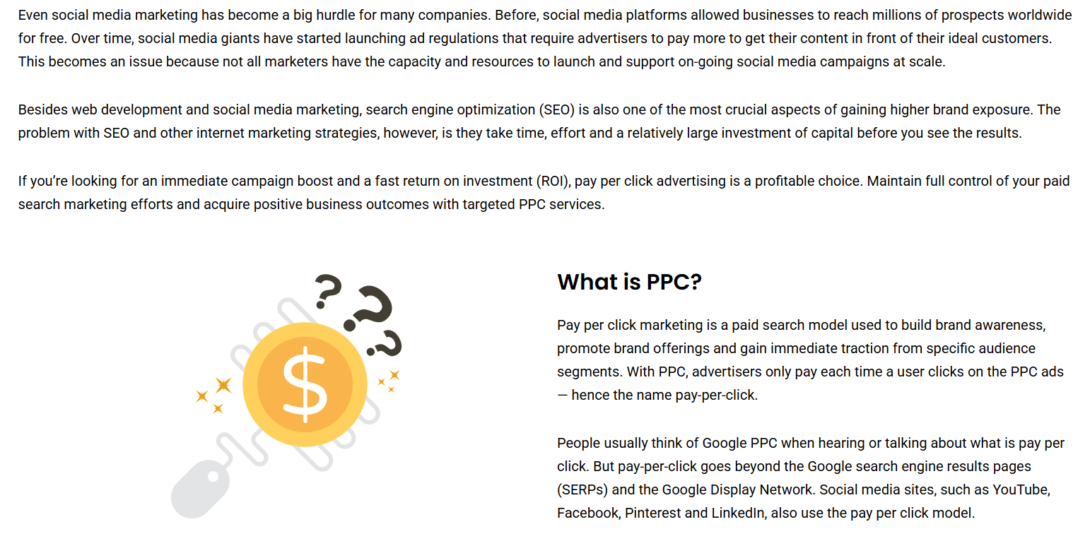 PPC management services can help businesses create effective campaigns that target the right audience, select the most relevant keywords, and optimize their ads to generate the highest possible return on investment (ROI). PPC management services may include tasks such as keyword research, ad creation and copywriting, bid management, ad tracking and reporting, and landing page optimization.